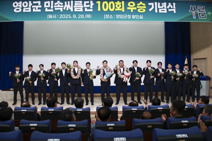 이날 기념식은 2017년 창단한 영암군민속씨름단이 이달 1~7일 충북 영동군에서 열린 영동세계국악엑스포장사 씨름대회 단체전 우승으로 통산 100승의 금자탑을 쌓은 성과를 축하하는 자리.