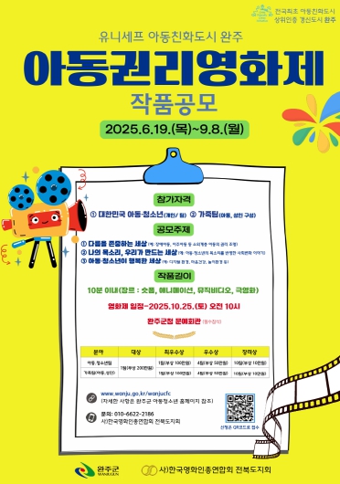 유희태 완주군수는 “이번 공모전은 아이들이 자신의 삶과 권리를 직접 영상에 담아내는 소중한 기회가 될 것”이라며 “아이들이 존중받고 행복한 사회를 만들기 위해 완주군은 앞으로도 다양한 참여 기회를 제공하겠다”고 밝혔다.