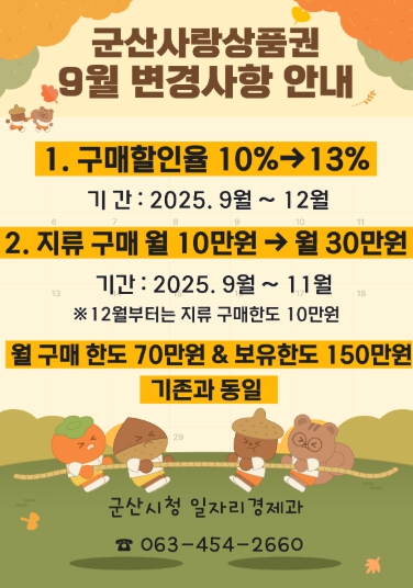 ![]() 군산사랑상품권 9월부터 12월까지 할인율 13%로 상향 |