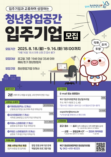 문인 북구청장은 “이번 모집에 역량 있는 청년 창업가들의 많은 관심과 참여를 바란다”며 “앞으로도 청년들이 안정적으로 창업에 도전할 수 있는 북구를 조성하기 위해 다양한 지원을 아끼지 않겠다”고 말했다.
