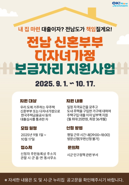 신혼부부·다자녀가정 보금자리 지원사업은 전남에 거주하는 무주택 신혼부부와 2자녀 이상 다자녀가정을 대상으로 주택 구입 대출이자 일부를 최대 36개월간 월 25만 원까지 지원하는 정책이다.