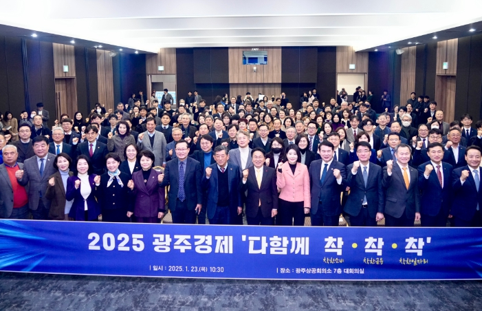 ![]() 강기정 광주광역시장이 지난 1월 23일 광주상공회의소 대회의실에서 열린 ‘2025 광주경제 다함께 착착착(착한소비·착한금융·착한일자리) 광주’에 참석해 경제단체, 산업계 등 76개 기관‧단체 관계자들과 함께 소비는 늘리고, 부담은 줄이고, 투자는 키우는 경제대책에 나서기로 결의를 다진 뒤 기념촬영을 하고 있다./광주광역시 제공 |