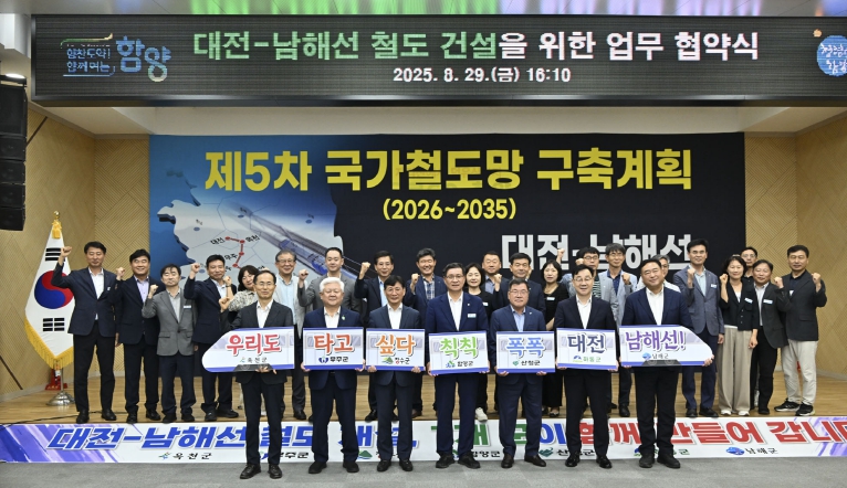 협약안에는 철도 건설사업의 필요성과 타당성 확보를 위한 공동 연구 및 자료 공유, 지역개발 관광 활성화 후속 사업과의 연계 방안 모색 등 대전~남해선 철도사업이 국토교통부에서 수립 중인 제5차 국가 철도망 구축계획에 반영될 수 있도록 공동대응한다는 내용이 담겼다.