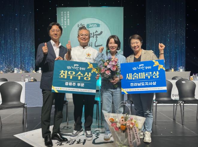 ![]() 우리술 품평회 수상 단체사진 (좌측부터 방현용 곡성농협군지부장, 안유성 명장, 시향가 양숙희 대표, 우희정 곡성군 농정과장) |