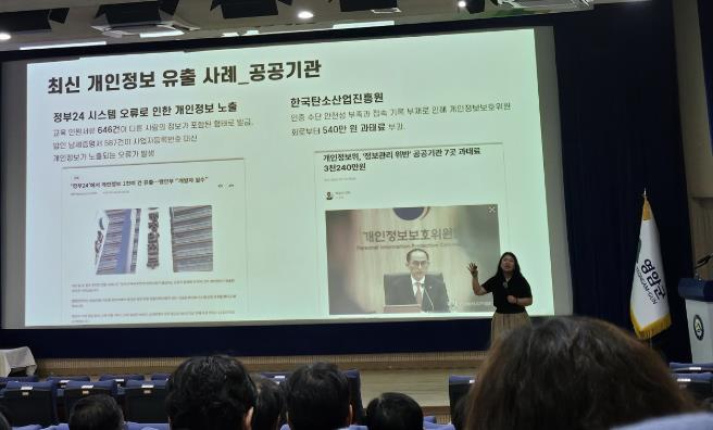 홍 대표는 강의에서 해킹, 업무과실 등으로 최근 빈번하게 발생하는 개인정보 유출 사례를 공유하며 책임감 있는 정보 관리를 강조했다.