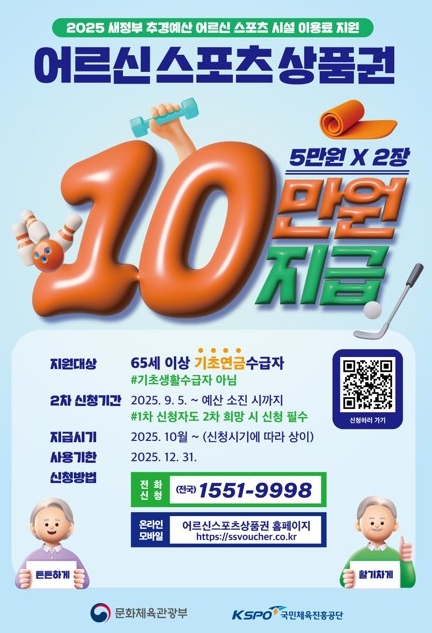 신청은 국민체육진흥공단 콜센터에 전화로 접수하거나 공식 누리집을 이용하면 된다. 네이버, 다음 등 포털사이트 검색창에 ‘어르신 스포츠 상품권’을 입력하면 누리집을 찾을 수 있다.