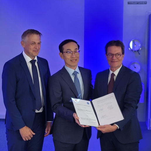 ![]() 업무협약 체결 후 기념촬영(가운데 여근택 한전 송변전운영처장, 제일 오른쪽 윌프리드 브로이어(Wilfried Breuer) MR사 CEO) |