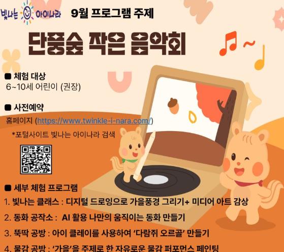 프로그램 세부 내용은 ▲디지털 드로잉을 활용한 가을풍경 그리기(빛나는 클래스) ▲자신이 그린 그림을 아트 캔버스에서 감상할 수 있는 미디어아트 체험(빛의 갤러리) ▲AI를 활용한 나만의 움직이는 동화 만들기(동화공작소) ▲아이클레이를 활용한 ‘다람쥐 오르골’ 만들기(뚝딱공방) ▲유리 벽면을 활용해 ‘가을’을 주제로 한 자유로운 물감 퍼포먼스 페인팅(물감 공방) 등으로 가을 정취를 느낄 수 있도록 마련했다.