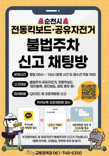 ![]() 순천시, ‘전동킥보드공유자전거 불법주차 신고 채팅방 운영’ |