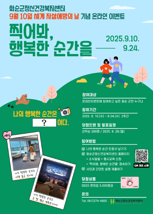 참여자는 ‘나의 행복한 순간’을 담은 인증 사진과 간단한 설명을 화순군정신건강복지센터 홈페이지(소식 알림'행사·교육 신청) 게시판에 9월 24일까지 게시하면 된다.