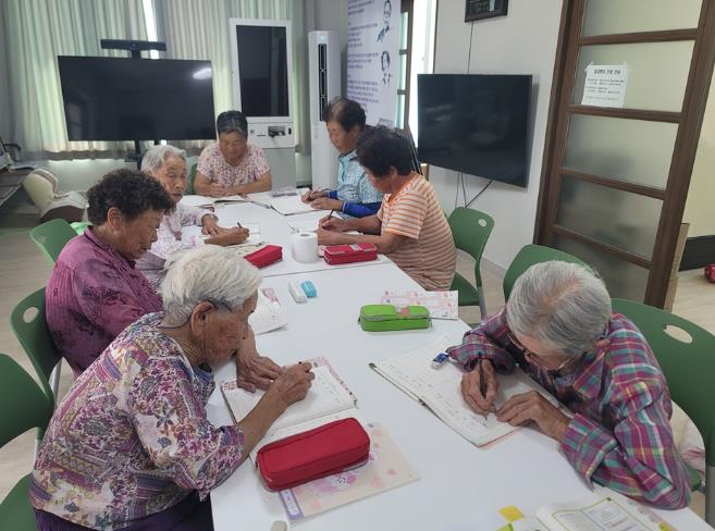 ![]() 경로당 입식테이블을 이용하여 문해교실 수업, 운동처방서비스를 하고 있다. |