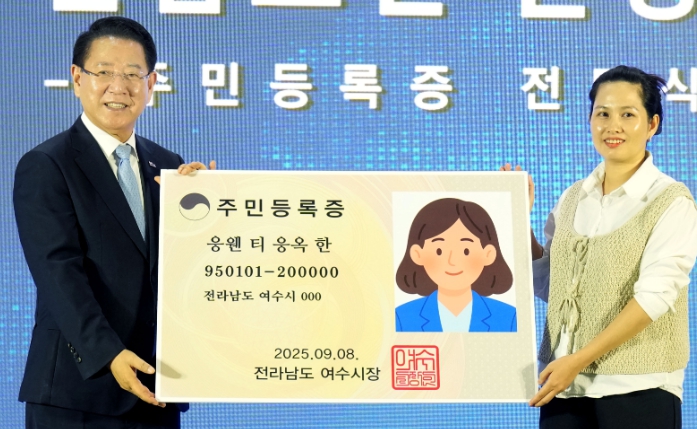 ![]() 김영록 전라남도지사가 8일 여수 상공회의소에서 열린 ‘전남 동부 이민외국인 종합지원센터 개소식’에 참석해 국적취득자 대표에게 주민등록증을 전달한 뒤 기념촬영을 하고 있다. |