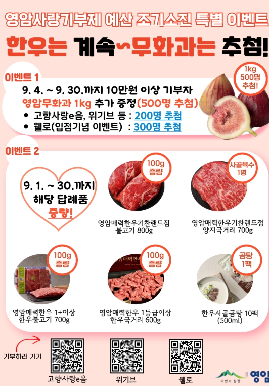 이영주 영암군 홍보전략실장은 “짧은 기간에도 출향인 등 전국 각지의 기부자분들이 큰 관심을 보내주신 덕분에 이벤트가 성황리에 마무리됐다. 추가로 진행되는 ‘한우는 계속, 무화과는 추첨’ 이벤트에도 많은 관심과 성원 바란다”고 전했다.