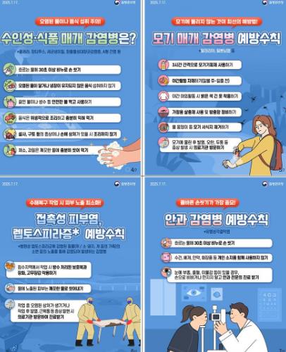 집중호우 이후에는 ▲오염된 물과 음식으로 인한 수인성 · 식품 매개 감염병(장관감염증, A형간염, 세균성 이질, 장티푸스 등), ▲물웅덩이에서 증식하는 모기로 인한 모기 매개 감염병(말라리아, 일본뇌염), ▲침수지역 오염된 물 접촉으로 인한 렙토스피라증, 접촉성 피부염, 유행성 눈병 등 풍수해 감염병이 발생할 위험이 높아진다.