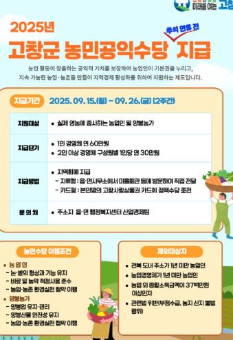 ![]() 고창군 ‘농민 공익수당’ 찾아가는 행정서비스로 추석 명절 전 지급 |