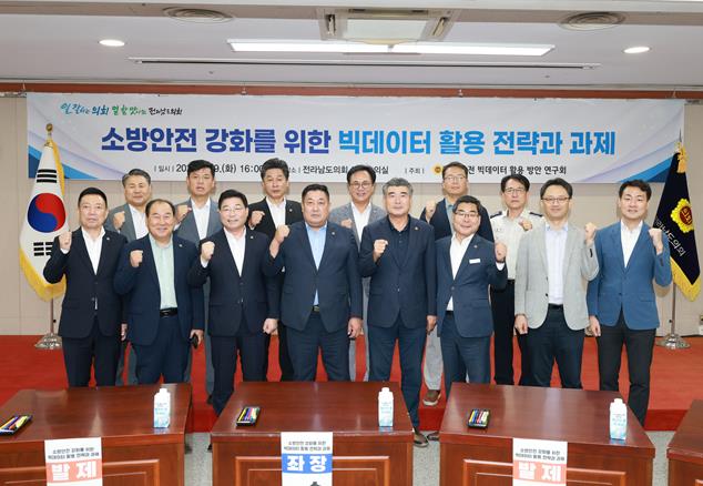 ![]() 9월 9일 전라남도의회 초의실에서 열린 ‘소방안전 강화를 위한 빅데이터 활용 전략과 과제’ 토론회에서 참석자들이 기념촬영을 하고 있다. |
