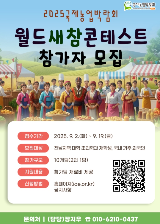 박관수 국제농업박람회 사무국장은 “월드새참콘테스트는 전남 농산물의 우수성을 알리고, 한국과 세계의 농업 문화를 연결하는 특별한 무대가 될 것”이라며 “청년 조리 인재와 외국인 참가자가 함께 어울려 창의적 새참 문화를 선보이도록 적극 지원하겠다”고 말했다.