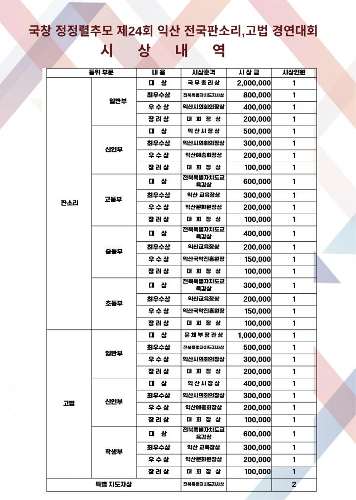![]() 제25회 국창 정정열 추모 전국 판소리·고법 경연대회 시상내역 / 사진제공=익산시 |