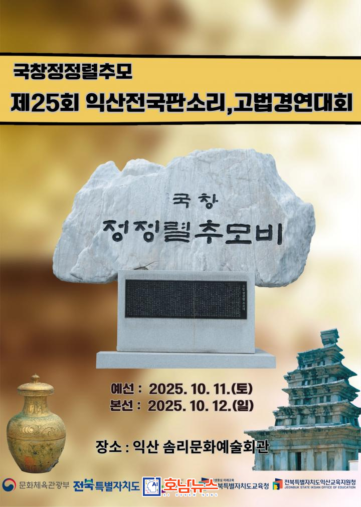 Iksan City announced that it will host the 25th National Pansori and Gobup Competition in Memory of Master Jeong Jeong-yeol at the Songri Culture and Arts Center in Iksan from October 11 (Sat) to 12 (Sun).