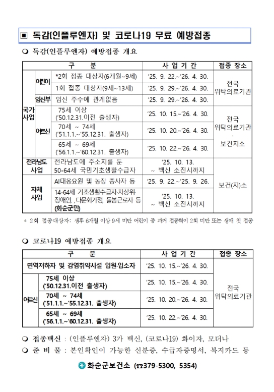 특히, 화순군은 국가예방접종 대상이 아닌 건강 취약 저소득층과 면역력이 낮고 감염 시 합병증 발생이 높은 군민을 대상으로 무료 접종을 전개한다.