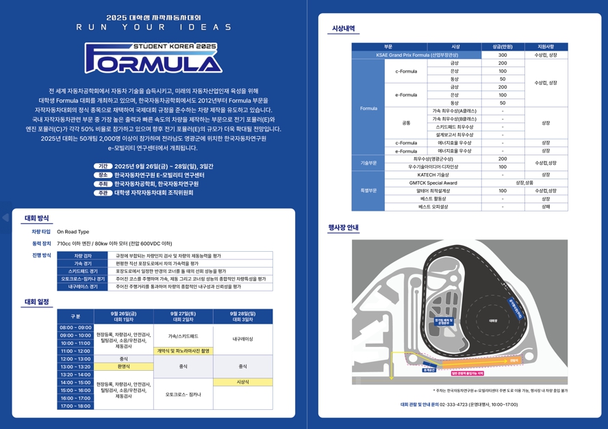 출전 차량은 국제 규정에 맞춘 포뮬러 경주차로, 엔진(710cc 이하) 또는 전기모터(80kW 이하)를 장착해 최고 시속 150km까지 주행할 수 있으며, 차량 성능 검사를 시작으로 가속·스키드패드·오토크로스-짐카나·내구레이싱 등 다양한 종목으로 진행된다.