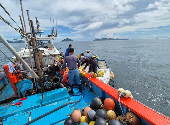 ![]() 여수·고흥·완도 경계 해역의 불법 양식시설물(부표)을 철거하고 있다. |