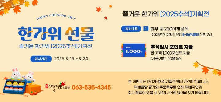 시는 15일부터 30일까지 16일간 정읍시 대표 온라인 쇼핑몰인 단풍미인쇼핑몰에서 ‘2025 추석 기획전’을 운영한다고 밝혔다.