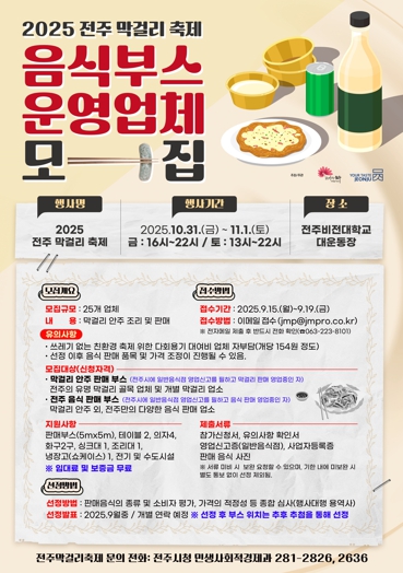시는 오는 10월 31일과 11월 1일 이틀간 전주비전대학교 대운동장에서 개최되는 ‘2025 전주막걸리축제’에서 음식부스를 운영할 참여업체를 공개 모집한다고 15일 밝혔다.