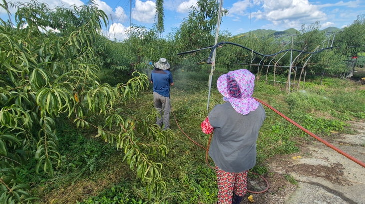 ![]() 한천면의 한 복숭아 농가 부부가 복숭아 수확 후 과원을 방제하는 장면 |