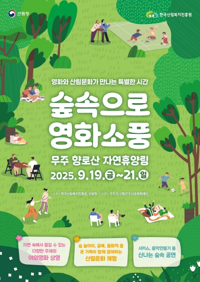 자연에서 즐길 수 있는 주제의 야외영화 2편(9. 19. (금) “어네스트와 셀레스틴: 멜로디 소동” / 20. (토) “윙키”)과 온 가족이 참여할 수 있는 산림문화 체험, 신나는 숲속 공연 등을 즐길 수 있다.