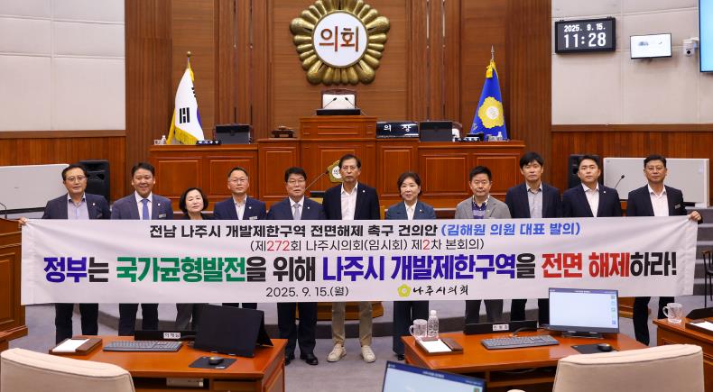 ![]() 나주시의회 ‘전남 나주시 개발제한구역 전면 해제 촉구 건의안’ 채택 |