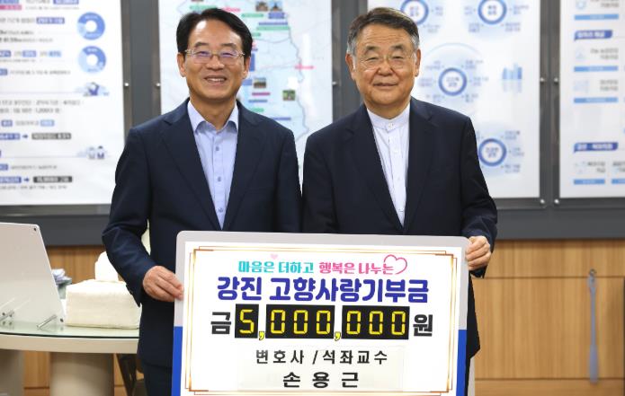 ![]() 손용근 변호사가 강진원 강진군수에게 고향사랑기부금 500만원을 전달하고 있다. |