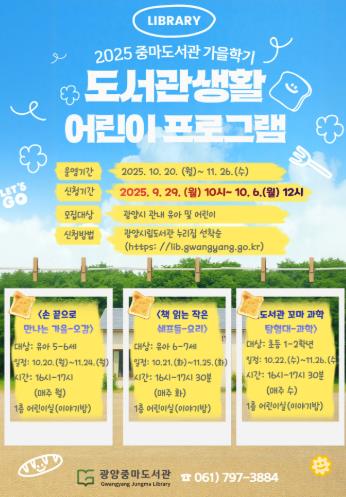 ![]() 광양중마도서관, 가을학기 어린이 독서프로그램 수강생 모집 |
