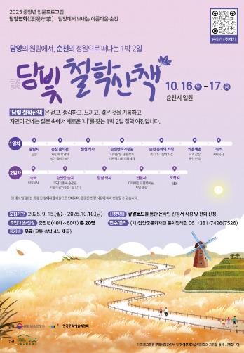 ![]() (재)담양군문화재단, 중장년 인문프로그램 '담빛 철학산책-순천편' 참가자 모집 |