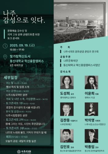 한편, ‘나주시 문화․관광 콘텐츠 연구회’에는 주최하는 토크콘서트는 당초 7월 19일 예정됐으나, 집중호우로 인한 지역 피해와 안전 우려로 한 차례 연기된 바 있다.