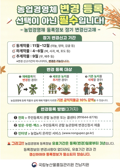 영광농관원 김근우 사무소장은 “경영체 등록정보의 정확도를 높이려면 농업인의 적극적인 참여가 필수적”이라고 강조하며, “재배품목이나 농지가 변경되면 이번 정기 변경 신고기간에 꼭 신고해 달라”고 당부했다.