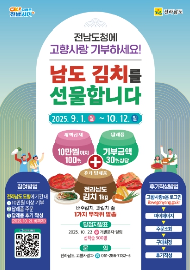 강경문 고향사랑과장은 “이번 이벤트는 고향을 생각하는 마음이 가장 깊어지는 명절에 전남 농가를 돕고, 함께 나눔을 실천하자는 취지에서 마련됐다”며 “기부로 마음을 나누고, 전남의 맛으로 풍성한 명절을 즐기시길 바란다”고 말했다.