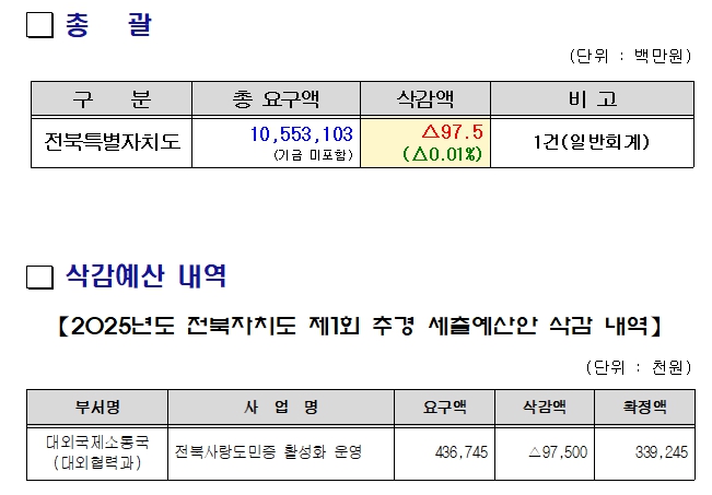 ![]() 예결특위, 2025년도 전북특별자치도제2회 추가경정예산안 심의 결과 |