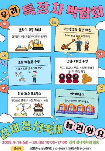 또한, 김제 특화 산업인 특장차를 활용한‘제3회 미래 특장차산업 박람회’도 연계 추진해 아이들과 청소년이 실제 특장차와 관련한 직업 세계를 경험하고, 지역 산업의 비전과 가능성에 공감하며 미래에 대한 꿈을 설계할 수 있는 기회를 제공할 계획이다.