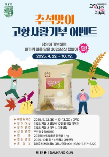 군 관계자는 “한가위를 맞이해 담양을 응원해 주시는 분들께 감사의 마음을 담아 이번 이벤트를 준비했다”며, “많은 관심과 참여를 부탁드리며, 앞으로도 건전한 기부 문화 확산에 앞장서겠다”라고 말했다.