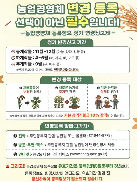그러나 올해까지는 정기변경 신고 계도기간으로 운영하고 내년부터는 직불금 등이 감액될 수 있으므로 농업경영체 등록정보의 변경등록이 필수적이다.