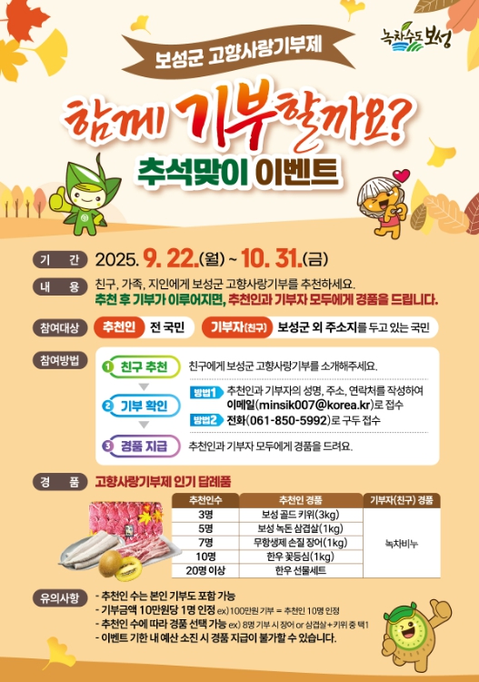 참여 방법은 이벤트 기간 내에 추천인과 추천을 받은 기부자의 정보를 이메일 또는 전화(보성군청 인구정책과 061-850-5992)로 접수하면 된다.