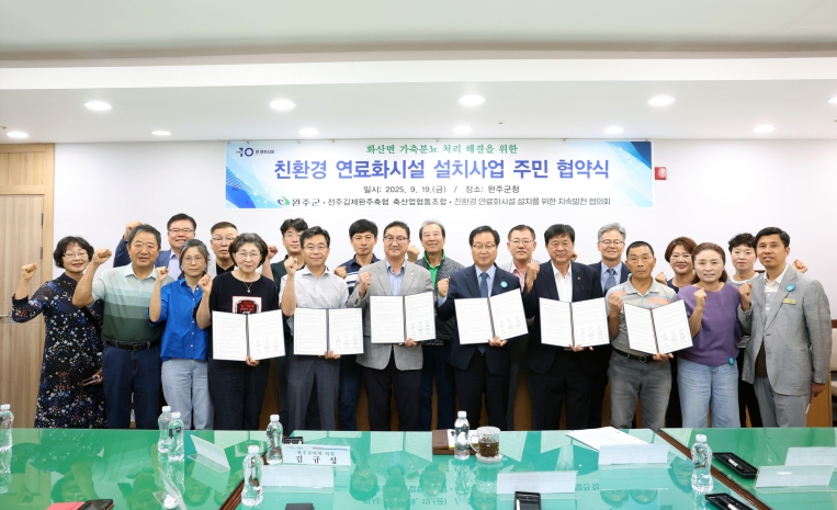 19일 완주군은 군청 전략회의실에서 화산면 운곡리 수실·돈의·부현마을 주민, 전주김제완주축산업협동조합, 친환경 연료화시설 설치사업 지속발전협의회와 함께 ‘친환경 연료화시설 설치사업 주민 협약’을 체결했다.