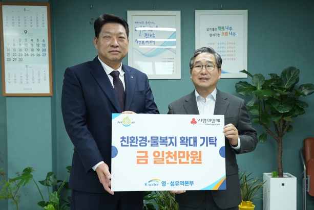 ![]() 주인호 한국수자원공사 영·섬유역본부장(왼쪽)이 24일 나주시청에서 강상구 나주시 부시장에게 친환경 물 복지 지원금 1천만 원을 전달했다. |