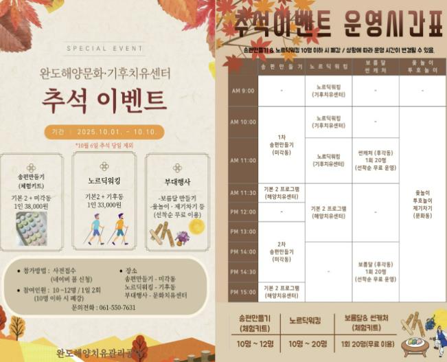 이벤트는 10월 1일부터 10일까지 9일간(추석 당일 휴무) 완도해양치유센터와 해양기후·문화 치유센터에서 진행된다.