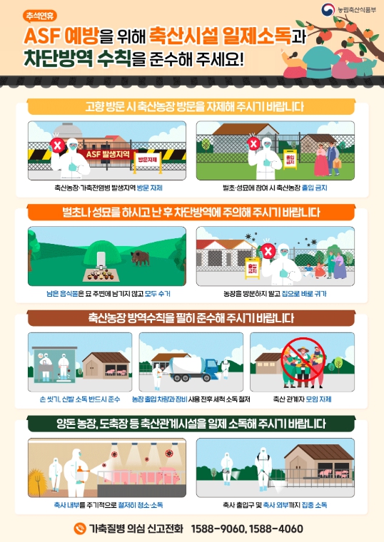 이강기 농업정책과장은 “추석 연휴는 귀성 차량과 사람의 이동이 집중되는 시기로 가축전염병이 확산하기 쉬운 환경”이라며 “축산농가와 시민 모두가 방역 수칙을 철저히 준수하고, 이상 징후 발생 시 신속히 신고해 주시길 바란다.