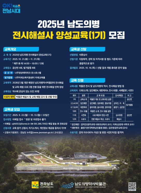 박중환 남도의병역사박물관 개관준비단장은 “‘남도의병’이라는 주제를 쉽고 재밌게 전달해 감동을 주는 전문인력 양성을 목표로 교육을 추진하고 있다”며 “앞으로 박물관을 도민과 함께하는 역사적 문화 공동체 허브로 발전시켜 나가겠다”고 말했다.