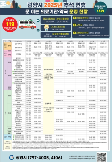 ![]() 광양시, 추석 연휴 종합상황실 운영으로 생활불편 최소화 - 총무과(추석 연휴 문 여는 약국, 의료기관 운영 현황) |