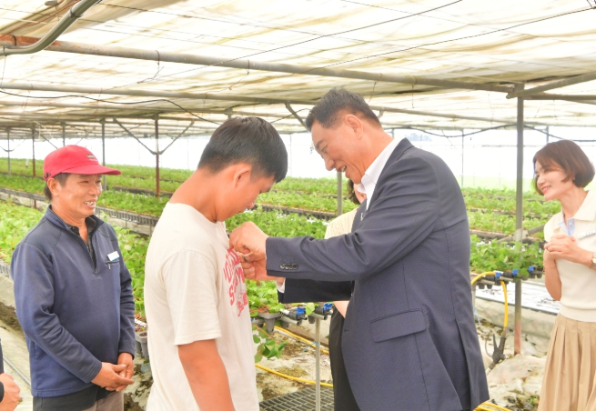 ![]() 7월 김한종 장성군수가 외국인 계절근로자에게 한글 이름 명찰을 달아주고 있다. |