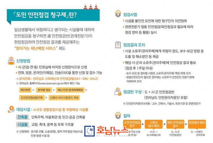 전라남도는 도민의 생명과 재산을 보호하기 위해 일상생활 주변의 위험요소를 찾아 무료로 점검하는 ‘도민 안전점검 청구제’를 운영하고 있다고 7일 밝혔다.